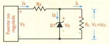 Donde Vin es la tensión de entrada, Vr la tensión en la resistencia serie y Vz la tensión del zener o de la resistencia de carga.{\displaystyle Ie=Iz+Is}